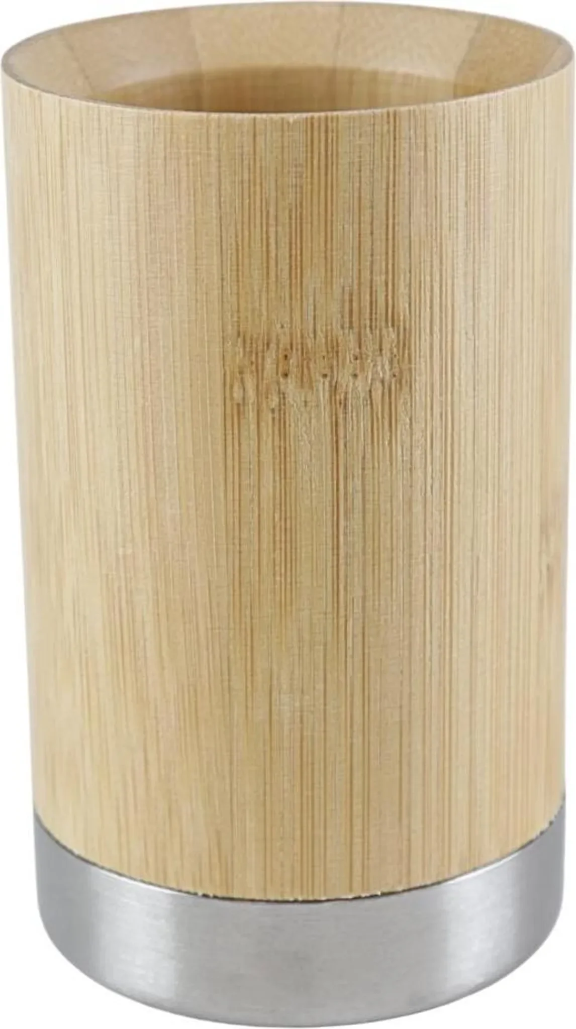 Der Zahnputzbecher „Bonja“ kombiniert warm gemaserten Bambus mit einem silberfarbenen Edelstahlboden und sorgt so für einen modernen und natürlichen Akzent im Badezimmer. Durch die große Öffnung bietet der Becher ausreichend Platz für Zahnbürsten, Zahnpasta und weitere Pflegeutensilien.