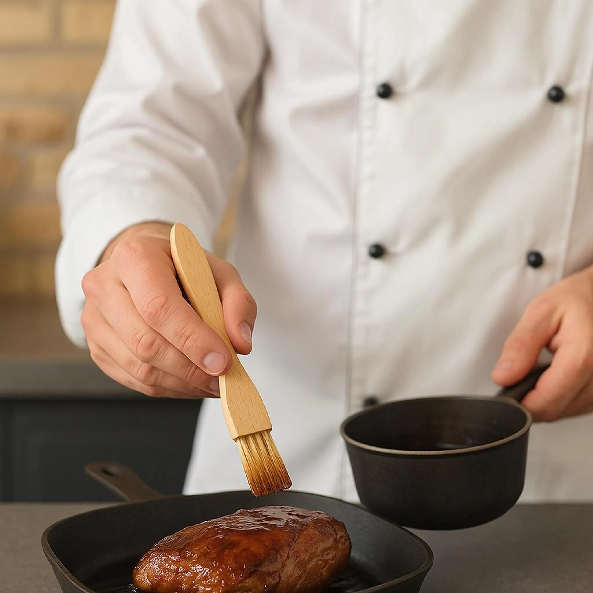 Seine robuste Verarbeitung sorgt für eine lange Nutzungsdauer, während der ergonomische Griff ein komfortables Arbeiten auch über längere Zeit ermöglicht. Ebenso eignet sich der Pinsel zum Auftragen von Marinaden und Soßen.