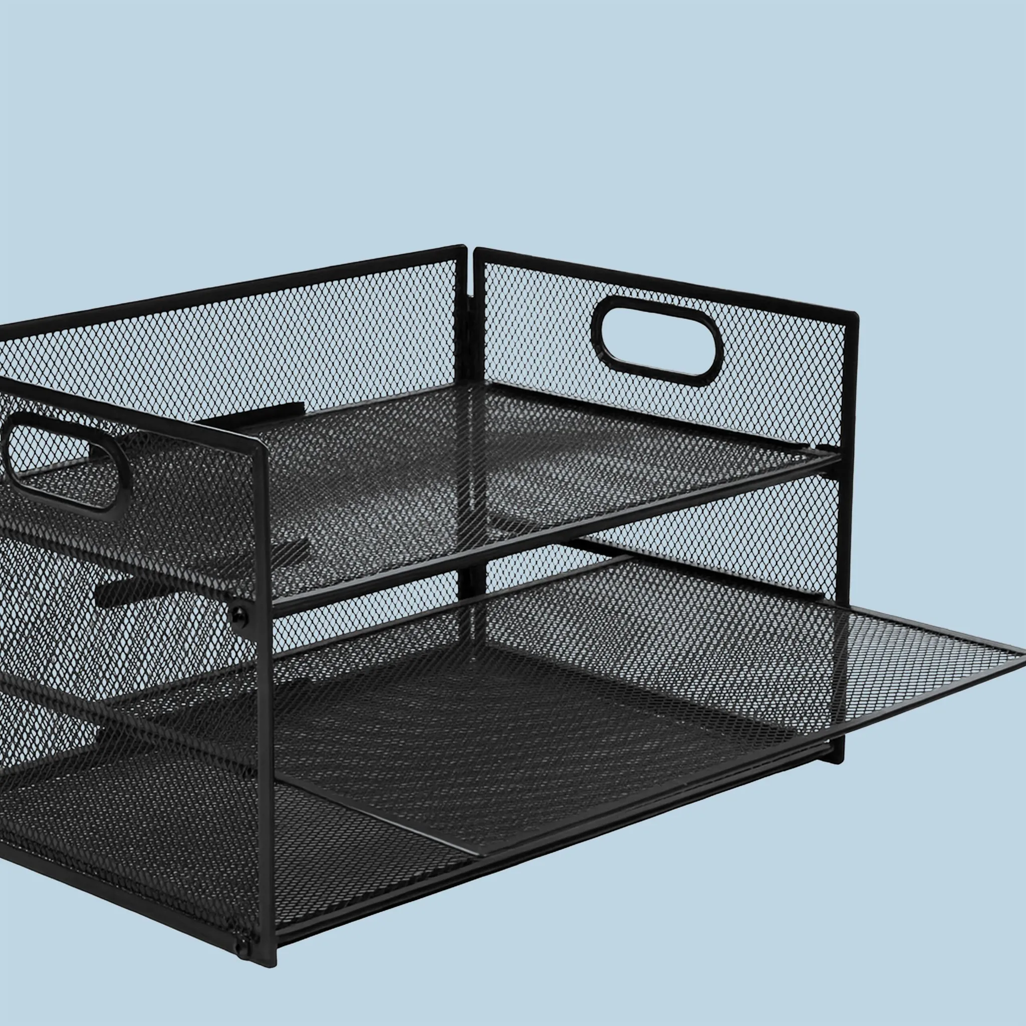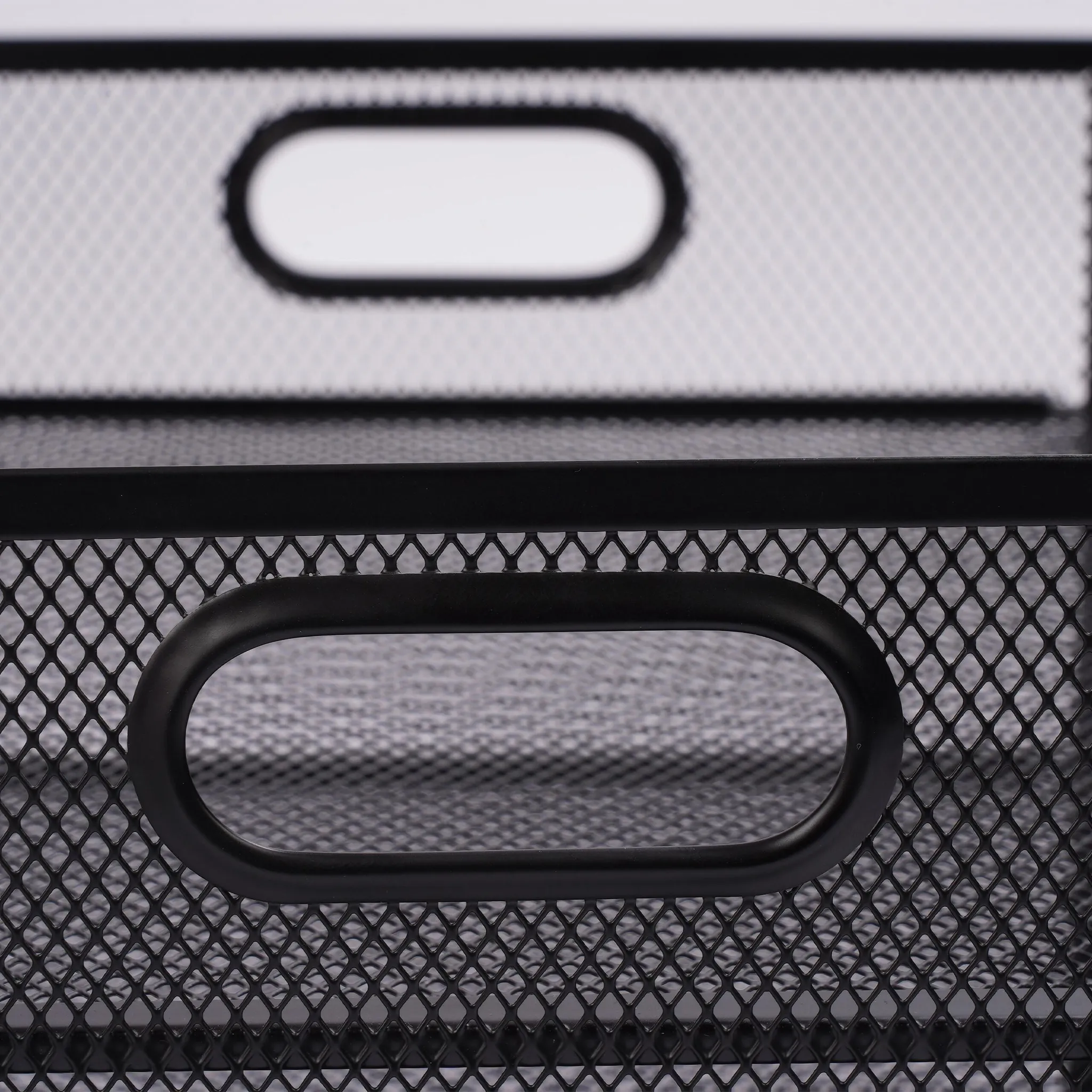 Dank seitlicher Tragegriffe lässt sich der Organizer flexibel am Arbeitsplatz versetzen. Die offene Gitterstruktur aus Eisen verleiht Stabilität, minimiert Staubablagerungen und unterstützt eine gute Übersicht über den Inhalt.